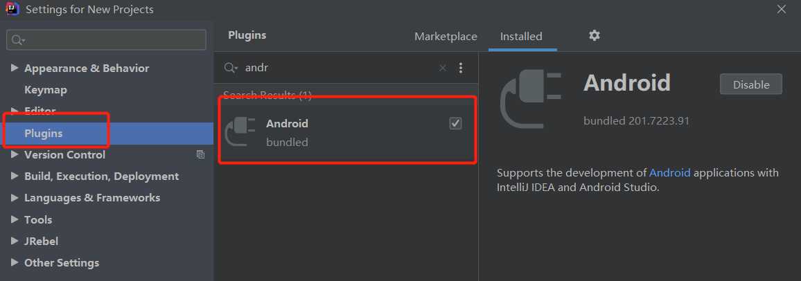 如果你咋创建项目没有这个Android选项时,需要在插件中心开启,如下