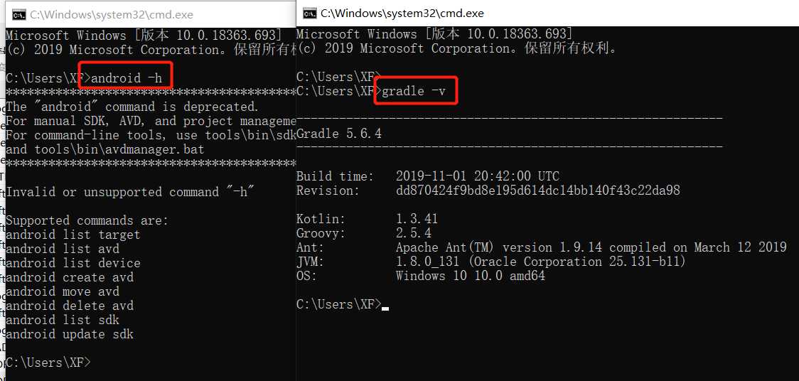 打开CMD分别输入 gradle -v android -h检测是否配置成功