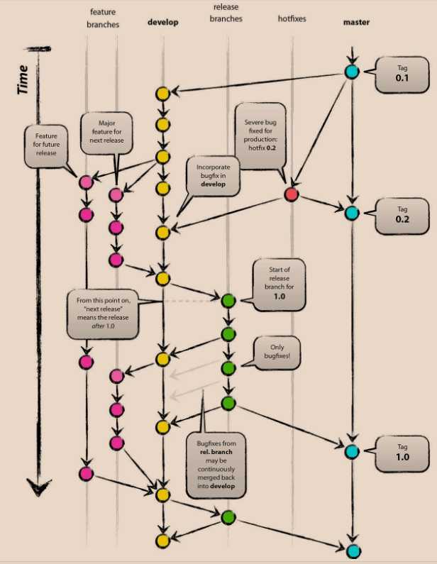 “当有一组feature开发完成,首先会合并到develop分支,进入提测时,会创建release分支。如果测试过程中若存在bug需要修复,则直接由开发者在release分支修复并提交。当测试完成之后,合并release分支到master和develop分支,此时master为最新代码,用作上线。