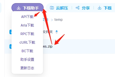 5、选择需要下载的文件,然后点击下载助手,选择API下载