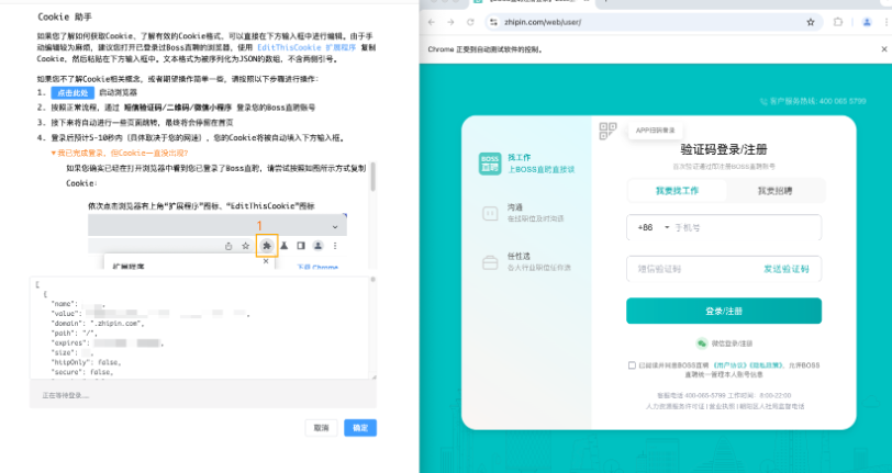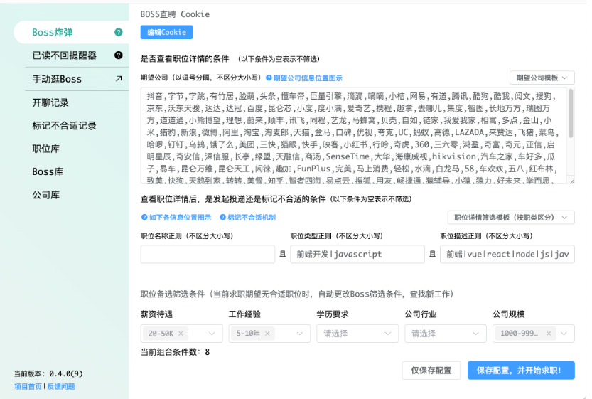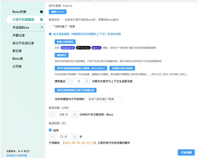 一款 Boss 直聘自动化求职工具,支持快速海投、自动开聊、已读提醒、职位信息抓取、不合适职位标记、僵尸职位清理。旨在减少求职过程中的重复操作,并支持接入多个大语言模型(如 OpenAI、阿里云等),用于生成聊天内容,增强自动化智能程度。