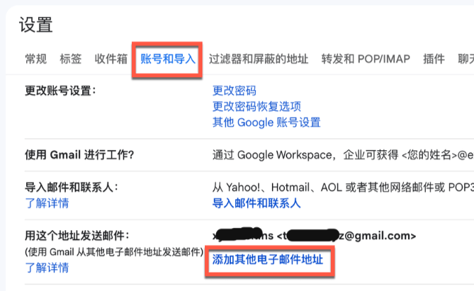 2、找到 “账号和导入” 这一项,点进去。进去之后,就能看到一个叫 “添加其他电子邮件地址”的链接,再点它一下。这时候会弹出一个小窗口,填上你的域名邮箱地址。