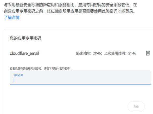 2、开启两步验证后,创建一个应用专用密码。在生成的应用专用密码页面,取一个名称并点击创建。